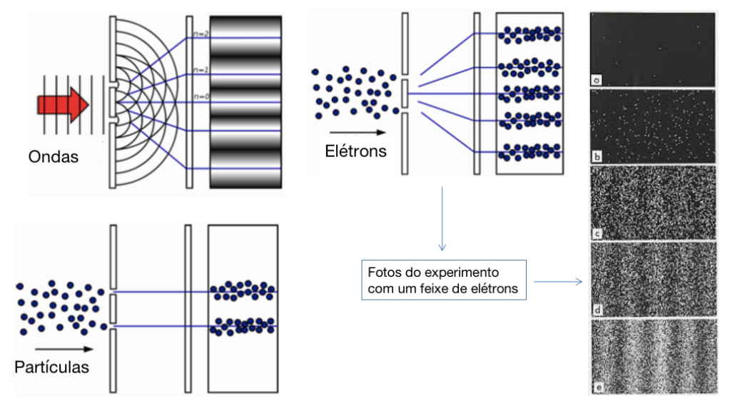 Figura: Experimento de Dupla Fenda realizado com ondas, partículas e elétrons. Os cinco padrões de interferência apresentados no canto direito representam uma foto real do experimento com elétrons.