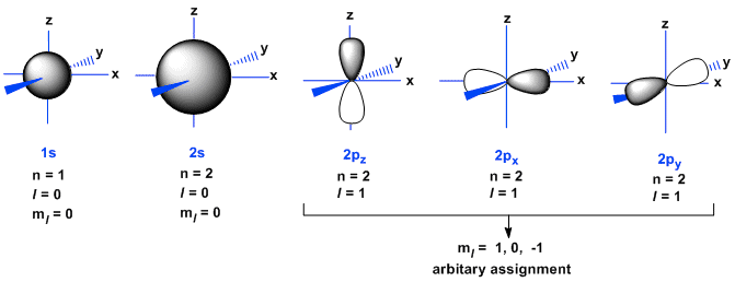 A Figura abaixo mostra uma representação artística dos orbitais 1s, 2s, e 2p ( 2px, 2py , 2pz). A nomenclatura de orbitais (s, p, d, f, …) é muito usada em estudos de espectroscopia atômica e molecular, na qual é discutido em outro post.