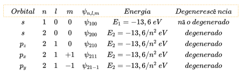 Conforme listado abaixo (Tabela 1), para cada valor de n, existem n2 autofunções degeneradas, ou seja, com o mesmo valor de energia En.