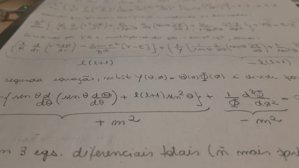 Note que no primeiro termo aparece a derivada da função R(r), logo, temos uma equação diferencial total e não parcial, pois R(r) depende apenas de uma variável (r). No entanto, no segundo termo, aparece a derivada parcial da função Y (θ, Ⴔ) que é função de duas variáveis, logo, temos uma equação diferencial parcial. Nosso objetivo é separar as equações diferenciais parciais em equações diferenciais totais. Para isso, vamos adotar alguns artifícios matemáticos, conforme descrito abaixo: