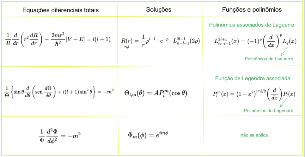 Desta forma, ficamos com três equações diferenciais totais e não mais parciais a serem resolvidas. Como já temos a solução de cada uma delas tabeladas, vamos usar essas soluções prontas, pois deriva-las se torna muito complexo. Na tabela abaixo apresentamos as equações diferenciais totais obtidas e suas respectivas soluções (tabeladas), bem como, algumas funções e polinômios tabelados que também são usados nas soluções.