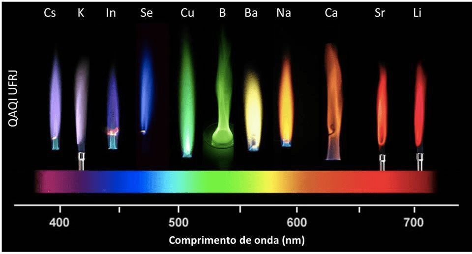 Em espectroscopia atômica a substância que está sendo analisada precisa antes ser decomposta em átomos por meio de uma chama, um forno ou um plasma (ou seja, substâncias liquidas e sólidas precisam ser atomizadas). Abaixo, você pode observar o teste da chama, na qual você coloca um material (líquidos ou pós) em uma chama e parte desse material é atomizado. Quando esses átomos absorvem uma quantidade específica de energia de uma chama eles emitem luz no comprimento de onda específico ao qual absorveram. Desta forma, para diferentes materiais ou elementos químicos (como por exemplo, sais compostos por metais: NaCl, CuCl2, etc.) você pode observar a emissão de energia em diferentes cores conforme for o valor de energia absorvido (ou seja, conforme for o comprimento de onda/freqüência da energia absorvida). Podemos observar, pois a energia absorvida/emitida é na faixa do visível, caso contrário, não poderíamos observar. (OBS: Em espectros moleculares, na qual ocorrem transições rotacionais – faixa do micro-ondas e vibracionais – faixa do infra-vermelho não observamos a luz emitida).