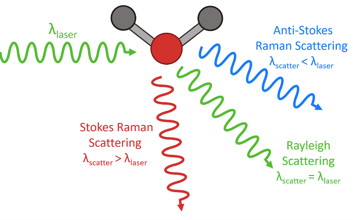 No espalhamento Raman (1930 – Nobel Física), um laser incide perpendicularmente sobre uma amostra e é espalhado elástica ou inelásticamente. No caso elástico, os fótons espalhados têm frequência igual a dos incidentes, originando o efeito Rayleigh, na qual não fornece informações muito úteis sobre as características da amostra. Nos caso inelástico, os fótons espalhados têm frequência diferente das incidentes, originando o efeito Raman. Os fótons espalhados podem apresentar frequência menor (anti-Stokes) ou maior (Stokes) que a freqüência da radiação incidente, conforme ilustrado na Figura 1.