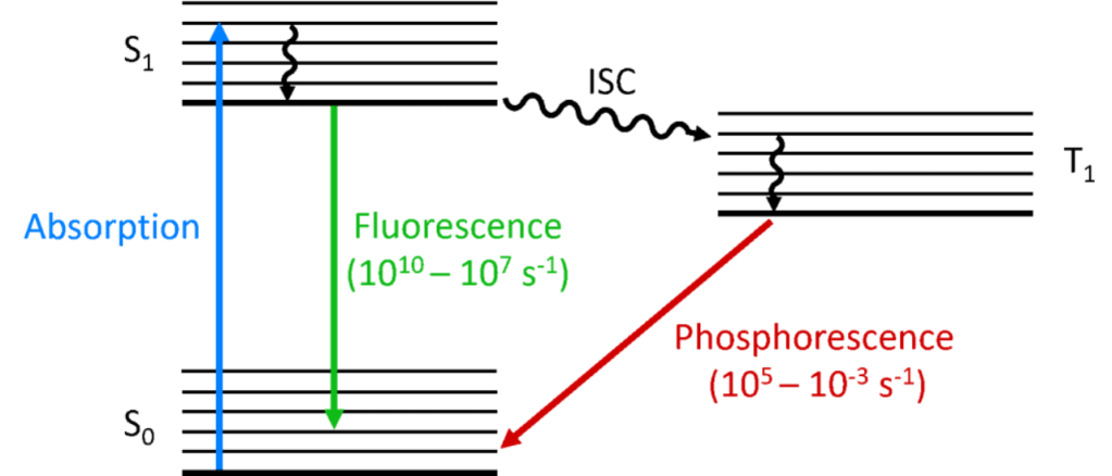 Quando um fóton é absorvido pela molécula, um dos elétrons é promovido para um nível de energia mais elevado e a molécula fica agora em um estado excitado. O estado fundamental de uma molécula é (quase) sempre um estado singleto (S0) e devido à conservação do momento angular o estado fotoexcitado também deve ser um estado singleto (S1). O decaimento do estado S1 de volta ao S0 é uma transição permitida (uma vez que ambos os estados têm a mesma multiplicidade de spin), resultando em fotoluminescência imediata que ocorre na escala de tempo de picossegundos a nanossegundos e é chamada de fluorescência (decaimento rápido) (Este decaimento está representado na cor verde da Figura 2).