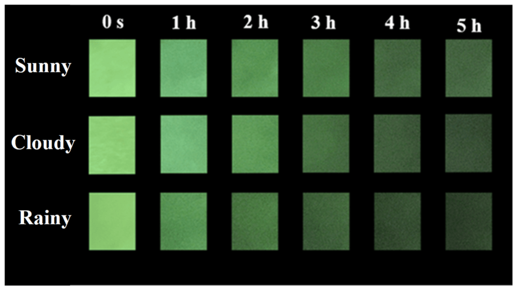 Figura: Imagens de brilho residual de revestimentos luminescentes obtidas após excitação solar por 2 horas em diferentes condições climáticas. Fonte: https://www.mdpi.com/2079-6412/13/6/1050