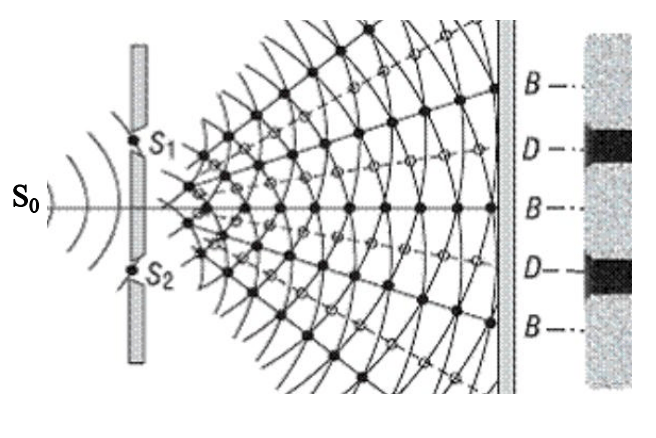 Por volta de 1800, Young confirmou as previsões de Huygens sobre a natureza ondulatória da luz, através de seu experimento da dupla fenda. Neste experimento, S1 e S2 funcionam como fontes pontuais, conforme demonstrado na Figura 2. Sabendo que a fonte principal, S0, é a mesma, as ondas provenientes de S1 e S2 tem mesmo comprimento de onda, mesma frequências e saem em fase. Assim, ao atingirem um ponto P (demonstrado na Figura 2) qualquer no anteparo, a diferença de fase entre as ondas é constante no tempo. Isso significa que os raios que saem de S1 e S2 são coerentes. Logo, veremos que em um ponto P qualquer, localizado a uma distância L do anteparo é possível prever se a interferência entre as ondas (S1 e S2) é construtiva ou destrutiva, na qual são observadas por padrões claros e escuros respectivamente, no anteparo.