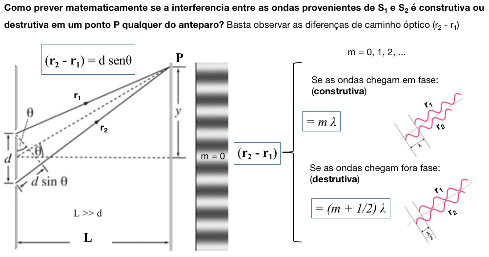 Conforme aparece na Figura 3, a interferência será construtiva, se a diferença de caminhos ópticos (r2 – r1) for um número inteiro (m) de comprimentos de onda. Caso a diferença de caminhos ópticos (r2 – r1) for meios comprimentos de onda (m + 1/2) a interferência é destrutiva.